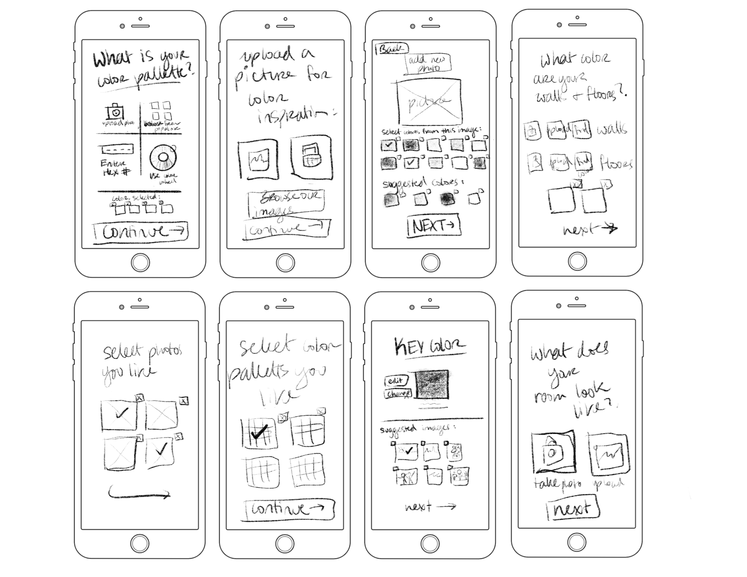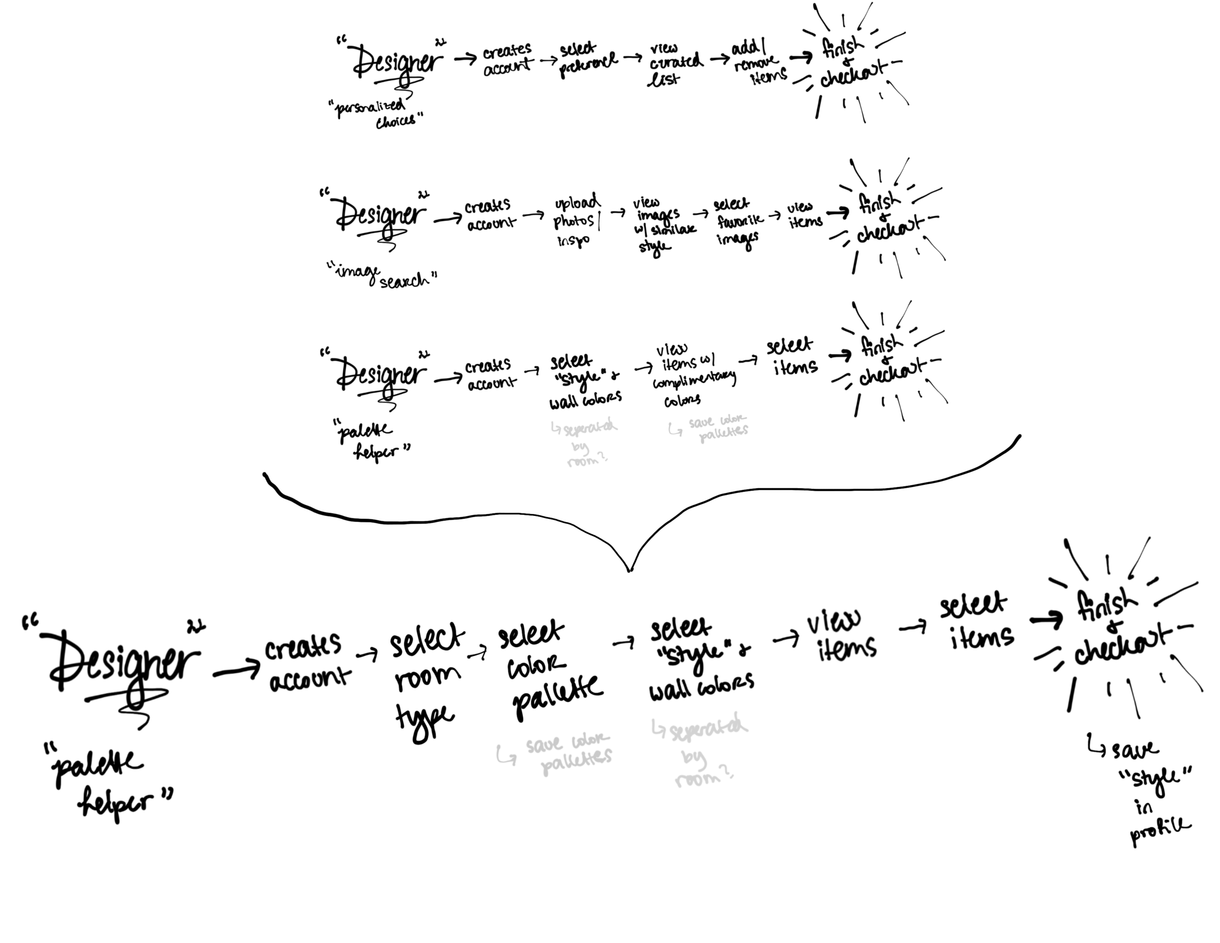 Users vary in terms of budget, space, and theme, but one thing that users know is what colors they like and dislike. These sketches illustrate the process of selecting colors they like using different methods available, then browsing “styles” that have the colors they selected. Since most people aren’t going to know the exact color they like by name, I explored giving them several options as to how they select colors. They can upload an image, they can view a selection of images, they can pick from a color wheel, or they can just enter the HEX.
